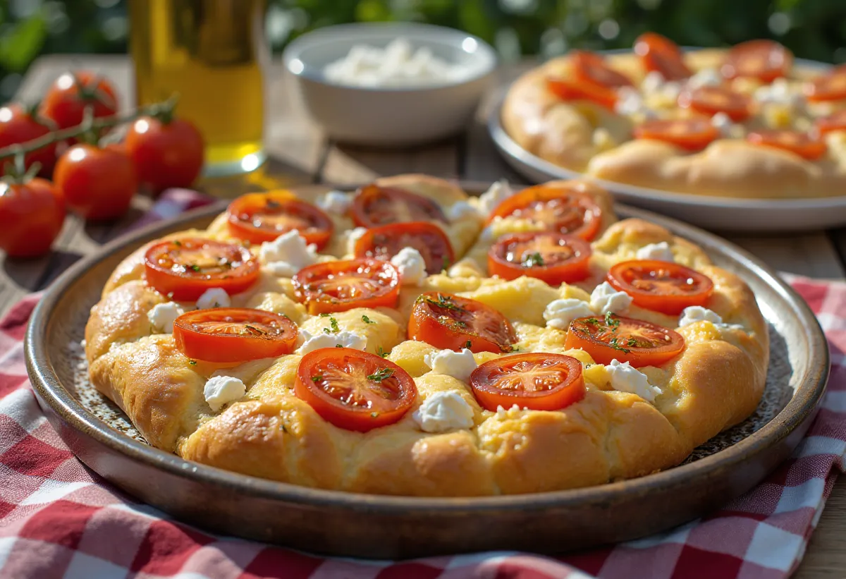 فن الفوكاشيا يكمن في الصبر والماء. تستخدم هذه الوصفة عجينة عالية الترطيب (تحتوي الكثير من الماء)، مما يسمح بتكون فقاعات هواء ضخمة. الطماطم والريكوتا على الوجه ليست مجرد إضافات، بل تصبح جزءًا من العجين: يسيل عصير الطماطم وزيت الزيتون في الحفر، لينكه داخل الخبز أيضًا.